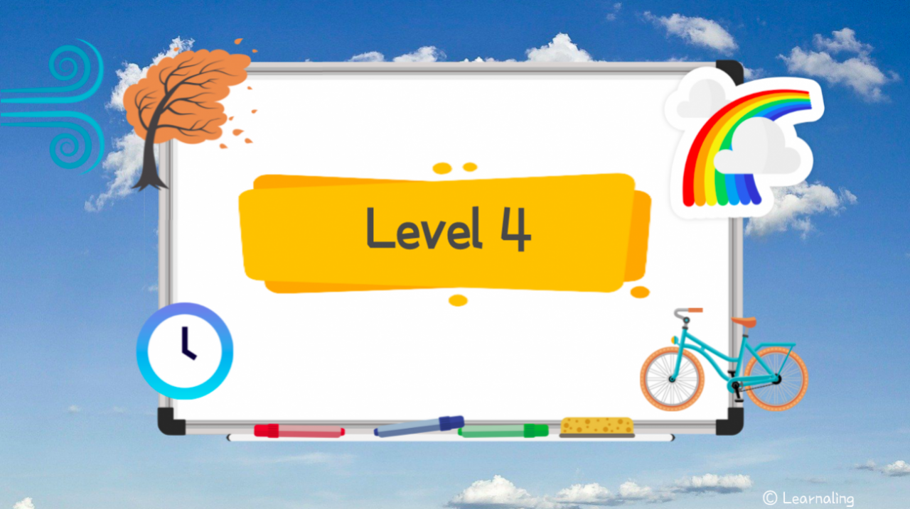 Learnaling Level 4 introduces students to upper A1 level vocabulary, grammar, speaking skills and reading texts. This course will help students prepare for Cambridge YLE Movers Exam.